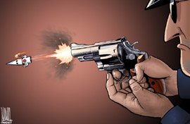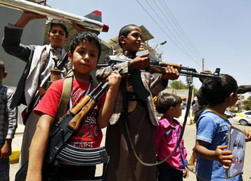 當(dāng)?shù)貢r間2015年4月13日,也門薩那的兒童手持槍械在聯(lián)合國駐也門辦事處外示威,抗議由沙特主導(dǎo)的空襲行動。
