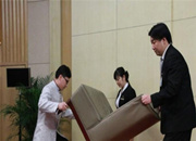 3月9日是政協第二場記者會,邀請到了姚明等五位政協委員談發揮人民政協在社會主義協商民主中的重要作用。看來為了給姚明委員挑選一把舒適的記者會椅子,工作人員還真是費盡了心思。左二系姚明的座椅,比其它的椅子都要寬大(中評社林艷攝)