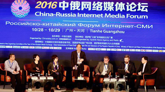 中俄嘉賓和媒體代表共同就“中俄網(wǎng)絡(luò)新媒體的合作與發(fā)展”這一主題展開了第一場分論壇討論,由中央人民廣播電臺(tái)央廣網(wǎng)副總編輯伍剛主持。