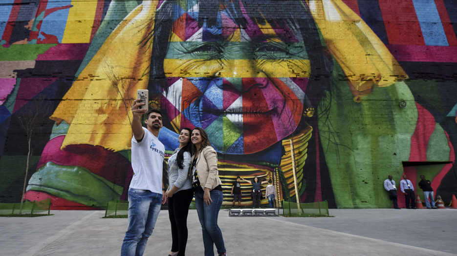 這幅噴繪壁畫總面積達(dá)3000平方米,由巴西噴繪壁畫藝術(shù)家科布拉在里約奧運(yùn)會開幕前夕創(chuàng)作完成。壁畫描繪了全球五大洲的土著居民頭像,并利用藍(lán)、黃、黑、綠、紅奧運(yùn)五環(huán)色彩為主色塊拼繪而成,用意借助奧運(yùn)精神宣傳全球不同種族、民族間的寬容與和諧。