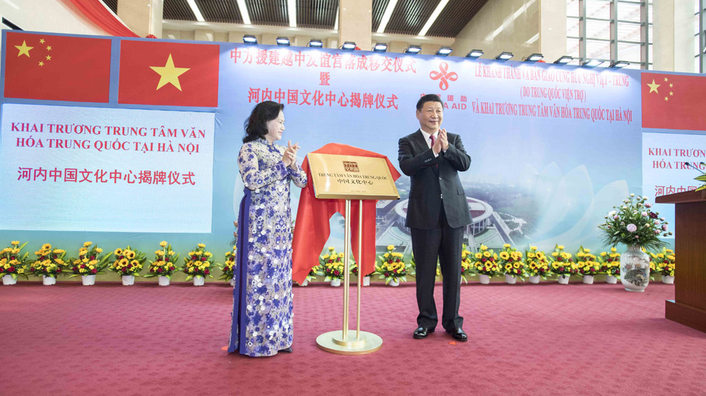 11月12日,中共中央總書記、國家主席習(xí)近平在河內(nèi)出席越中友誼宮落成移交儀式暨河內(nèi)中國文化中心揭牌儀式。這是習(xí)近平和越南國會主席阮氏金銀共同為中國文化中心揭牌。