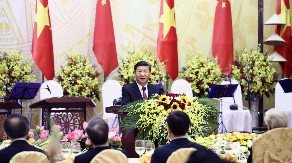 11月12日,中共中央總書記、國家主席習(xí)近平出席越共中央總書記阮富仲和越南國家主席陳大光在河內(nèi)國際會議中心舉行的隆重歡迎宴會。
