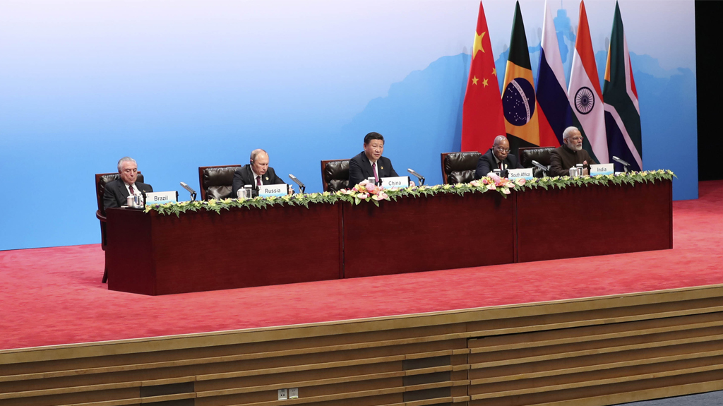 9月4日,國家主席習近平在廈門出席金磚國家領導人同工商理事會對話會并發表講話,巴西總統特梅爾、俄羅斯總統普京、印度總理莫迪、南非總統祖馬共同出席。