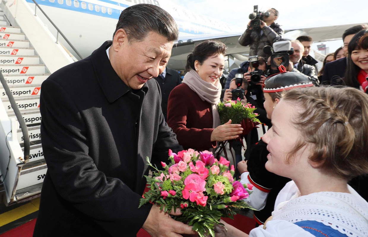 1月17日,國家主席習近平同瑞士聯邦主席洛伊特哈德在達沃斯共同啟動中瑞旅游年。兩國元首在熊貓冰雕像和印有中瑞兩國國旗及“中瑞旅游年”字樣的滑雪板旁合影留念。