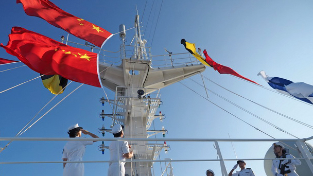 當?shù)貢r間2018年7月31日,正在執(zhí)行“和諧使命‐2018”任務的中國海軍和平方舟醫(yī)院船在南太平洋海域舉行隆重升旗儀式,慶祝中國人民解放軍建軍91周年。