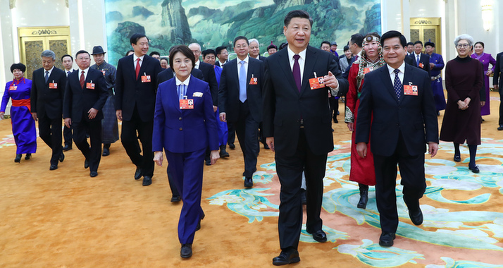 5日下午,中共中央總書記、國家主席、中央軍委主席習近平來到他所在的十三屆全國人大一次會議內蒙古代表團參加審議。習近平總書記向內蒙古廣大干部群眾表示衷心感謝,并同代表們合影。