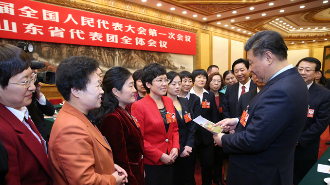 8日上午,習近平到山東代表團參加審議。正值“三八”國際勞動婦女節,習近平代表黨中央向女代表、女委員、女工作人員及全國各族各界婦女同胞,致以節日的祝賀和誠摯的祝福。
