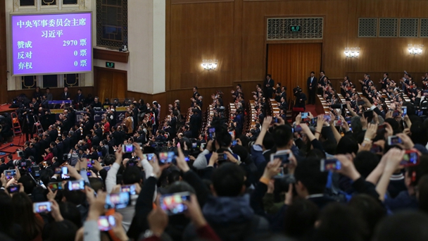 3月17日,十三屆全國人大一次會議在北京人民大會堂舉行第五次全體會議。習近平全票當選為中央軍委主席。