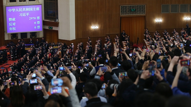 3月17日,十三屆全國人大一次會議在北京人民大會堂舉行第五次全體會議。習近平全票當選為國家主席。