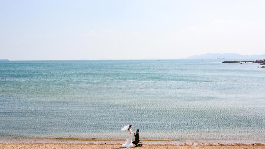 碧海藍(lán)天、紅瓦綠樹的青島吸引眾多情侶甜蜜留影,美麗的海濱城市洋溢著浪漫氣息。新華社記者 李紫恒 攝 一對情侶在青島第二海水浴場拍攝婚紗照(5月2日攝)。