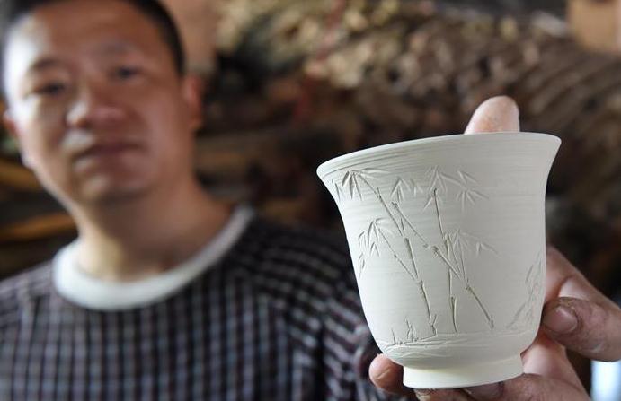 4月10日,陶瓷愛(ài)好者陳添貴在準(zhǔn)備放入窯中燒制的茶具坯體。
