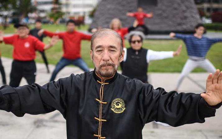 11月5日,在秘魯首都利馬的一個(gè)公園內(nèi),巴斯克斯(右)指導(dǎo)一名徒弟練習(xí)太極拳。