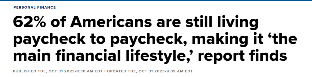 CNBC的報道稱,高通脹和高利率繼續(xù)給美國家庭造成壓力。根據美國借貸平臺“借貸俱樂部”(LendingClub)發(fā)布的報告,“‘月光’目前仍是美國消費者的主要財務生活方式”,截至2023年9月,有62%的美國成年人表示自己需要依賴工資過活。