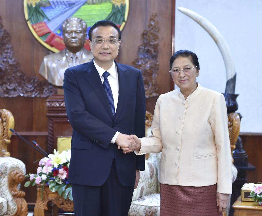 國務院總理李克強當地時間8日下午在萬象國會大廈會見老撾國會主席巴妮。