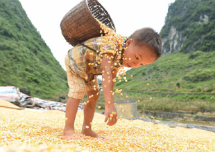 在廣西大化板升鄉(xiāng)弄勇村,7歲的藍桂景在幫忙家里晾曬玉米,他的家剛剛從山弄里搬到公路邊(8月7日攝)。新華社記者 黃孝邦 攝  在廣西大化七百弄鄉(xiāng)弄良村弄丘屯,讀初一的藍寶石在玉米地間騎著山地車玩耍(8月10日攝)。