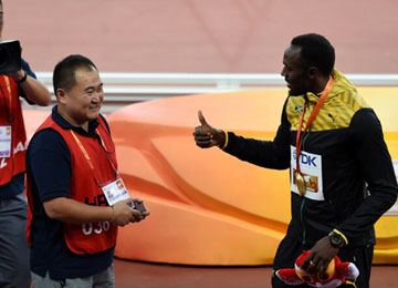 - 世錦賽溫馨一幕:“肇事”攝像師送博爾特手鏈 飛人豎大拇指