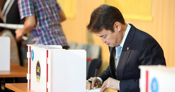 6月29日,在蒙古國首都烏蘭巴托,選民參加議會選舉投票。新華社記者鄭闖攝    6月29日,在蒙古國首都烏蘭巴托,蒙古國總統額勒貝格道爾吉在完成議會選舉投票后接受記者采訪。