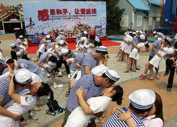 中國人民抗日戰爭暨世界反法西斯戰爭勝利70周年之際,今天上午,70對滬上情侶身著海軍服和護士服,相約上海歡樂谷,排成“70”字樣隊形,用浪漫擁吻,再現了1945年戰后紐約時代廣場的“世紀之吻”的經典畫面,用愛致敬和平,用歡樂慶??箲饎倮?0周年。