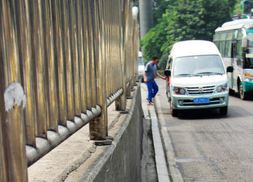2015年8月29日,重慶菜園壩火車站,原本寬闊的人行道路突然變窄,最窄處只有10厘米,行人只能側身而過。市民稱,這樣窄的人行道讓胖子情何以堪。何渝/東方IC