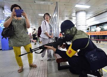 韓國士兵地鐵站舉行反恐演習 市民淡定從旁拍照