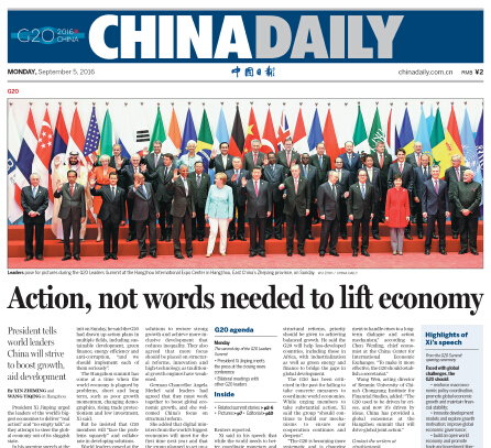 中國辦G20的目的,不是為了一己私利,而是為了更公平、更開放的世界經(jīng)濟(jì)秩序,這也是挽救世界經(jīng)濟(jì)的必由之路。