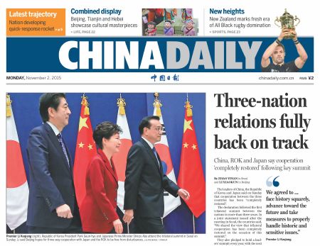 第六次中日本韓領(lǐng)導(dǎo)人會(huì)議于當(dāng)?shù)貢r(shí)間11月1日下午在首爾舉行。中國國務(wù)院總理李克強(qiáng)、韓國總統(tǒng)樸槿惠和日本首相安倍晉三出席會(huì)議。三方領(lǐng)導(dǎo)人表示,中日韓三國關(guān)系要回到正確的軌道上。