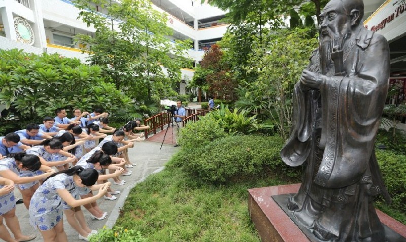廣東深圳開學日新教師穿旗袍拜孔子