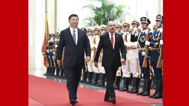 11月2日,國家主席習近平在北京人民大會堂同多米尼加總統梅迪納舉行會談。這是會談前,習近平在人民大會堂北大廳為梅迪納舉行歡迎儀式。新華社記者 燕雁 攝