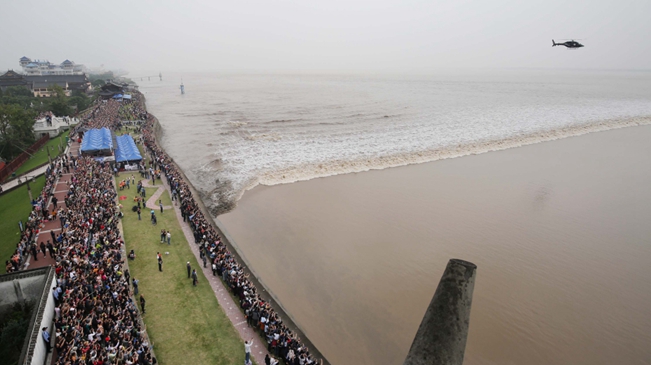 10月6日,農(nóng)歷八月十七是觀賞錢塘大潮的日子。當天中午12點,浙江海寧鹽官觀潮勝地擠滿了觀賞大潮的人潮。