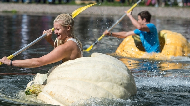 當地時間9月10日,德國費姆巴赫(Fambach)舉行傳統的南瓜賽舟會。和正式的比賽相比,坐在南瓜里的劃船比賽充滿了歡樂。