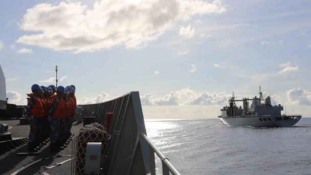 8月25日,在印度洋西部某海域,中國海軍遠航訪問編隊在“敵情”威脅條件下準備進行航行補給。連日來,中國海軍遠航訪問編隊在印度洋西部某海域航渡期間展開海上實彈演練。