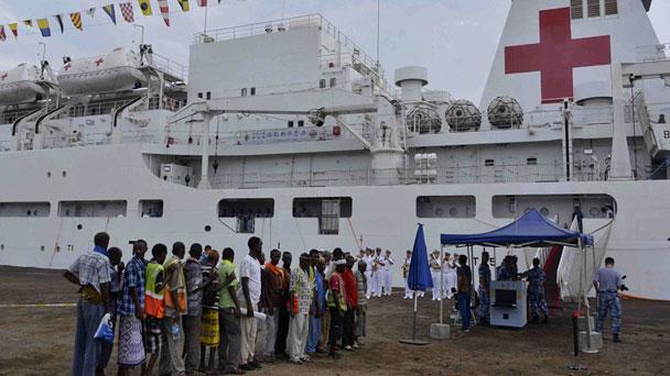 8月26日,吉布提民眾在停泊在吉布提的和平方舟醫(yī)院船內(nèi)接受中醫(yī)治療。中國海軍和平方舟醫(yī)院船自23日停泊在亞丁灣沿岸國家吉布提以來,每天為當?shù)孛癖娞峁┟赓M醫(yī)療服務,讓吉布提人感受到來自遙遠中國的真摯情誼。