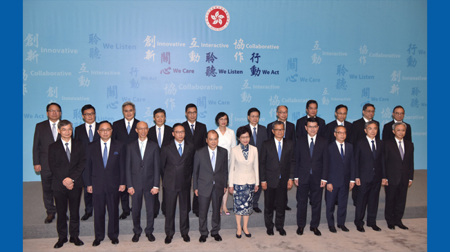 國務(wù)院于21日任命了香港特別行政區(qū)第五屆政府的主要官員。當(dāng)日下午,候任行政長官林鄭月娥與第五屆特區(qū)政府主要候任官員,包括政務(wù)司、財政司及律政司3位司長,13位局長及其他5位主要官員于特區(qū)政府總部首次全體亮相,