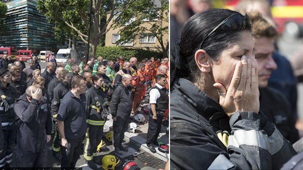當地時間6月19日,英國倫敦的緊急服務人員舉行默哀儀式,悼念格倫費爾大樓火災遇難者。