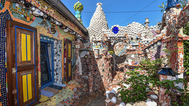 在德國柏林以南100公里的瑙恩多夫,德國藝術家斯蒂芬·莫德拉赫使用數千塊彩虹石、大理石、硬幣和金屬飾品等打造了一間五彩房。這間房子酷似童話城堡,顏色繽紛,造型別致。近日有攝影師來到這里,為莫德拉赫和他的五彩屋拍攝了一組照片,不妨來領略一下這間藝術之屋吧。