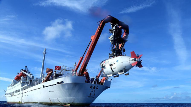 “蛟龍”號載人潛水器進入水中,進行中國大洋38航次最后一潛(6月13日攝)。豐富的生物樣品讓人大開眼界,觀看“蛟龍”號拍攝的海底視頻和采訪下潛人員,深淵區里的動物世界更是令人稱奇。