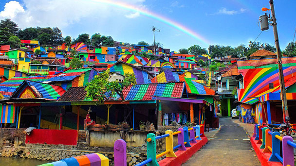 印度尼西亞爪哇省蘭薩里有一個不知名的貧困村Kampung Pelangi,在當地政府和村民的共同努力下,Kampung Pelangi搖身一變成了光彩奪目的“彩虹村”,吸引著世界各地的游客前來游玩。