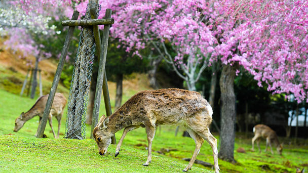 日本奈良公園櫻花盛開 小鹿穿梭其中如精靈
