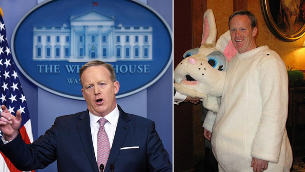 白宮發(fā)言人肖恩·斯派塞早年間的一段囧事最近又被翻了出來。2008年白宮復(fù)活節(jié)滾彩蛋活動中,他打扮成了一只復(fù)活節(jié)兔子。這畫風(fēng)跟他現(xiàn)在的形象可一點(diǎn)兒都不一樣。