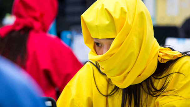 當地時間2017年2月20日,日本滋賀縣甲賀市,在甲賀市市政廳,城市旅游部門的員工身穿忍者服裝上班。