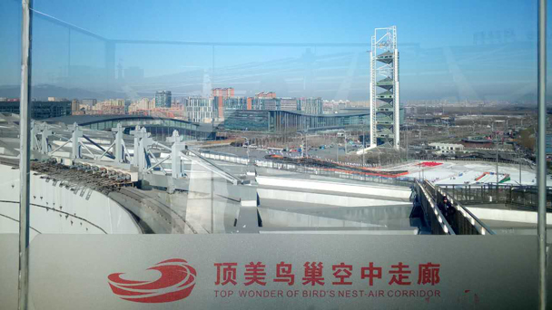 11日上午,在國家體育場主辦的鳥巢冰雪定向跑活動中,鳥巢首次開放了長達1000米的全新頂部觀光走廊“頂美”。