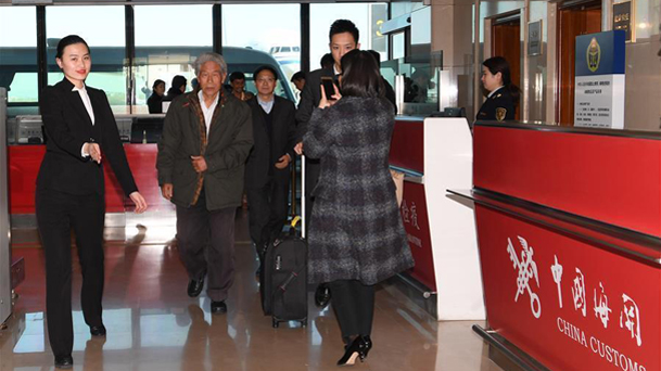2月11日,在印度滯留50多年的中國老人王琪(中)抵達北京首都國際機場,順利回國。當日是元宵佳節(jié),在印度滯留50多年、年近8旬的中國老人王琪在中國駐印度使館官員和在印家人的陪同下,從新德里乘飛機抵達北京,回到祖國懷抱。