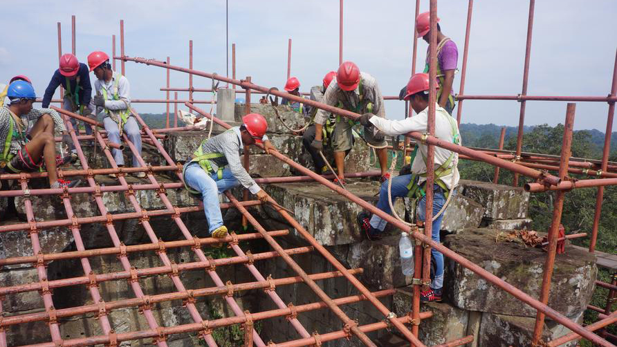 中國援柬吳哥古跡保護工程從上世紀90年代開始,先后修復了周薩神廟和茶膠寺。2018年7月9日,在柬埔寨暹粒,中國-柬埔寨政府吳哥古跡保護工作隊進行茶膠寺保護修復項目的結項收尾工作。