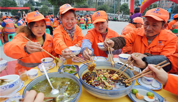 1月18日,重慶市綦江區一餐飲店免費為526名環衛工人設宴,提前請他們吃愛心“團年飯”,并送去節日的祝福。