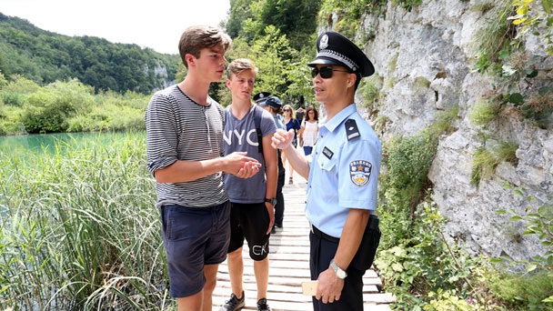7月26日,中國警察黎倍君在克羅地亞普利特維采湖群國家公園和游客溝通。此次聯合巡邏為期一個月,6名中國警官與克方警察在杜布羅夫尼克、薩格勒布和普利特維采湖群國家公園三地進行聯合巡邏,協助克警方處理與中國游客安全有關的問題,為中國游客與克警方溝通提供便利。