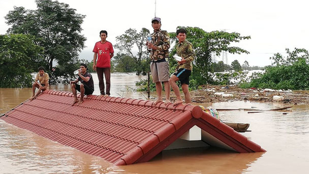 7月24日,在老撾阿速坡,居民在屋頂躲避潰壩事故帶來的洪水。老撾南部阿速坡省一水電站23日晚發(fā)生潰壩事故,已導(dǎo)致數(shù)人死亡、數(shù)百人失蹤。老撾南部阿速坡省一水電站23日晚發(fā)生潰壩事故,已導(dǎo)致數(shù)人死亡、數(shù)百人失蹤。