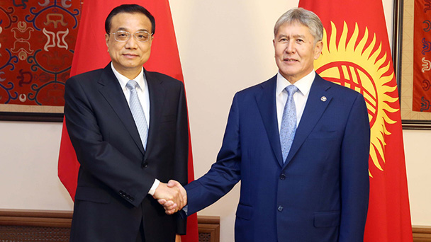 國務院總理李克強當地時間2日晚在比什凱克總統官邸會見吉爾吉斯斯坦總統阿坦巴耶夫。