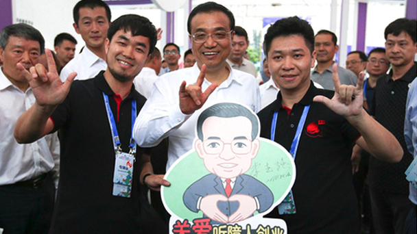 “總理,我們這個手勢是聽障人國際手勢,表示‘愛’的意思。”在一位聽障創業團隊負責人示范下,總理也打出同一手勢。李克強對這一創業團隊給予特殊關注,并應邀在“關愛聽障人創業”畫板上簽上自己的名字。