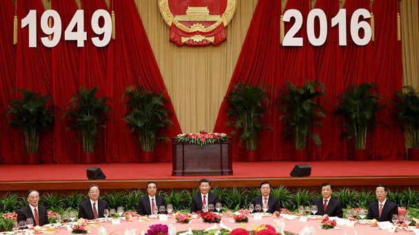 9月30日晚,國務院在人民大會堂舉行國慶招待會,熱烈慶祝中華人民共和國成立六十七周年。習近平、李克強、張德江、俞正聲、劉云山、王岐山、張高麗等黨和國家領導人與1200多位中外人士歡聚一堂,共慶共和國華誕。
