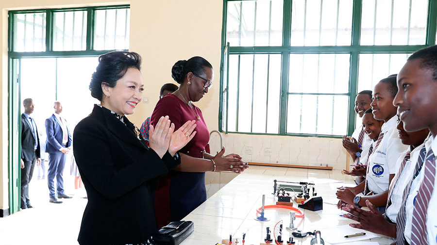 當(dāng)?shù)貢r間7月23日上午,國家主席習(xí)近平夫人彭麗媛在盧旺達總統(tǒng)夫人珍妮特陪同下參觀位于基加利北部加薩博區(qū)的法維女子中學(xué)。彭麗媛在盧旺達總統(tǒng)夫人珍妮特陪同下抵達學(xué)校,受到盧旺達教育部部長、加薩博區(qū)區(qū)長和法維女子中學(xué)校長等熱情迎接。
